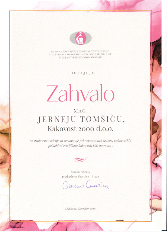 Z velikom ponosom je naš sodelavec mag.Jernej Tomšič prejel zahvalo za posebne dosežke v letu 2020 od Zbornice - Zveze za svetovanje pri vzpostavitvi sistema vodenja kakovosti in pridobitvi certifikata ISO 9001, mednarodnega standarda sistema vodenja kakovosti organizacije ISO. . Zahvalo je prejel na prednovoletni svečanosti Zbornice – Zveze, ki je potekala v ponedeljek, 21. decembra 2020, ob 18. uri.